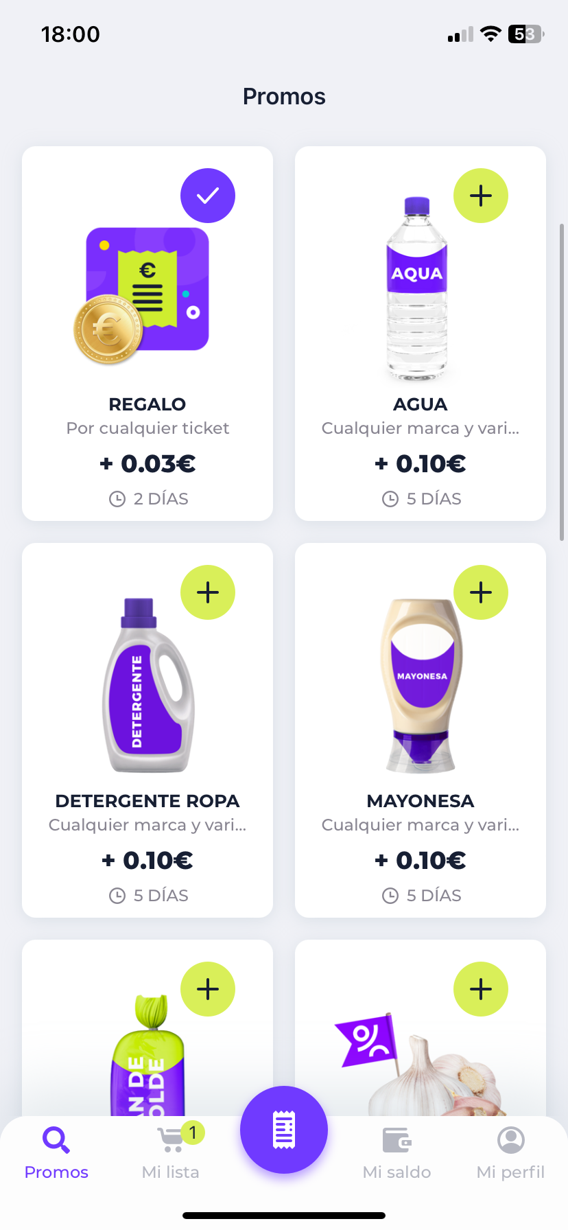- Haz foto del ticket de compra y selecciona los productos que has comprado. Te irán sumando céntimos.